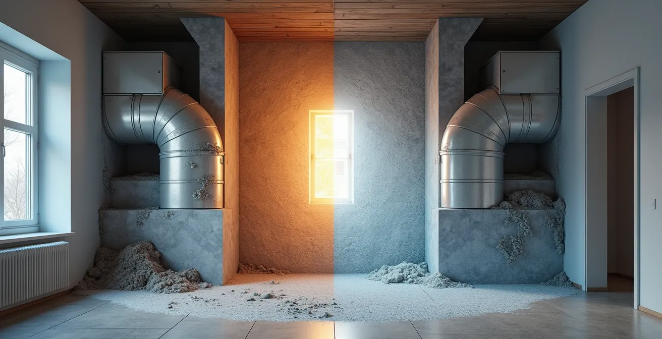 Le modèle de ces offres à bas prix repose sur des pratiques trompeuses. Souvent, une entreprise se présente avec un équipement sous-dimensionné, comme un simple aspirateur d’atelier, qui n’a pas la puissance nécessaire pour créer la pression négative requise. Cette technique est essentielle : elle consiste à mettre tout le réseau de conduits en succion pour éviter que la poussière et les contaminants délogés ne soient relâchés dans la maison. Un nettoyage mal fait peut aggraver la situation en dispersant des spores de moisissures et des particules fines dans votre environnement. De plus, le prix initial de 99 $ est un appât qui mène presque systématiquement à une liste d’extras “essentiels” une fois le technicien sur place, faisant grimper la facture bien au-delà d’un devis honnête.